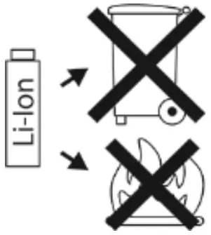 ![]() | Protect the rechargeable battery from heat, excessive solar radiation, fire, frost, water and humidity. Protect rechargeable battery packs from humidity |
