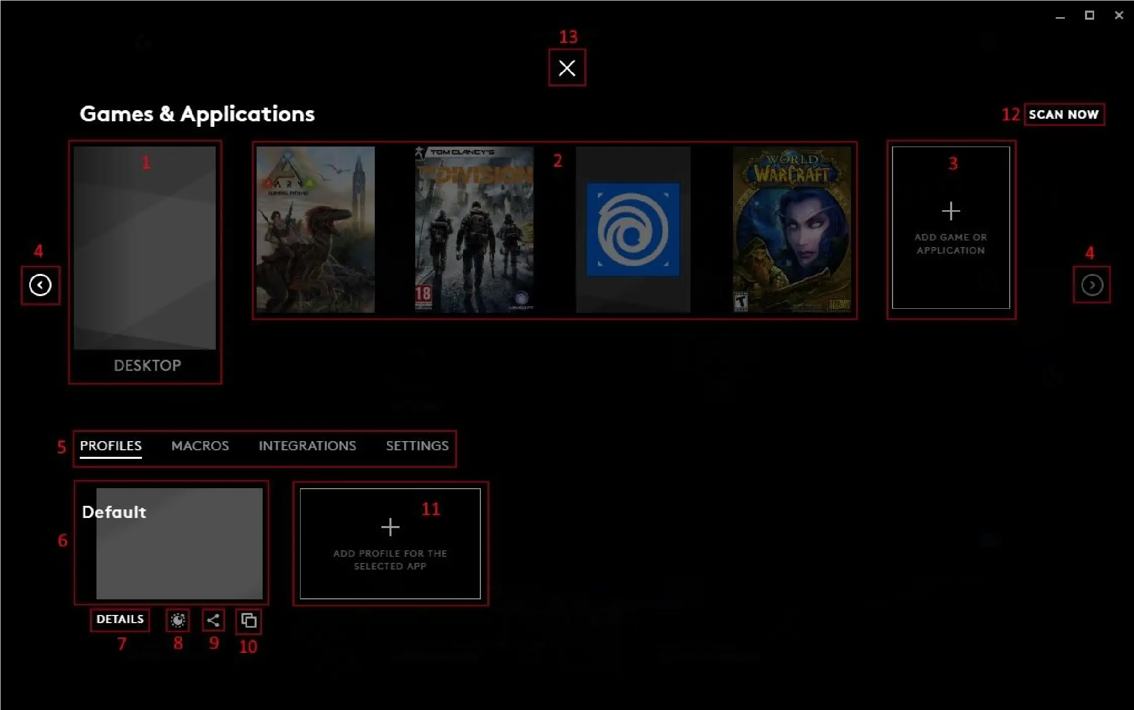 - Game profiles. G HUB will automatically detects games and setup profiles for you to configure. These will automatically activate when that game is running. You can add different user profiles to by clicking the + icon