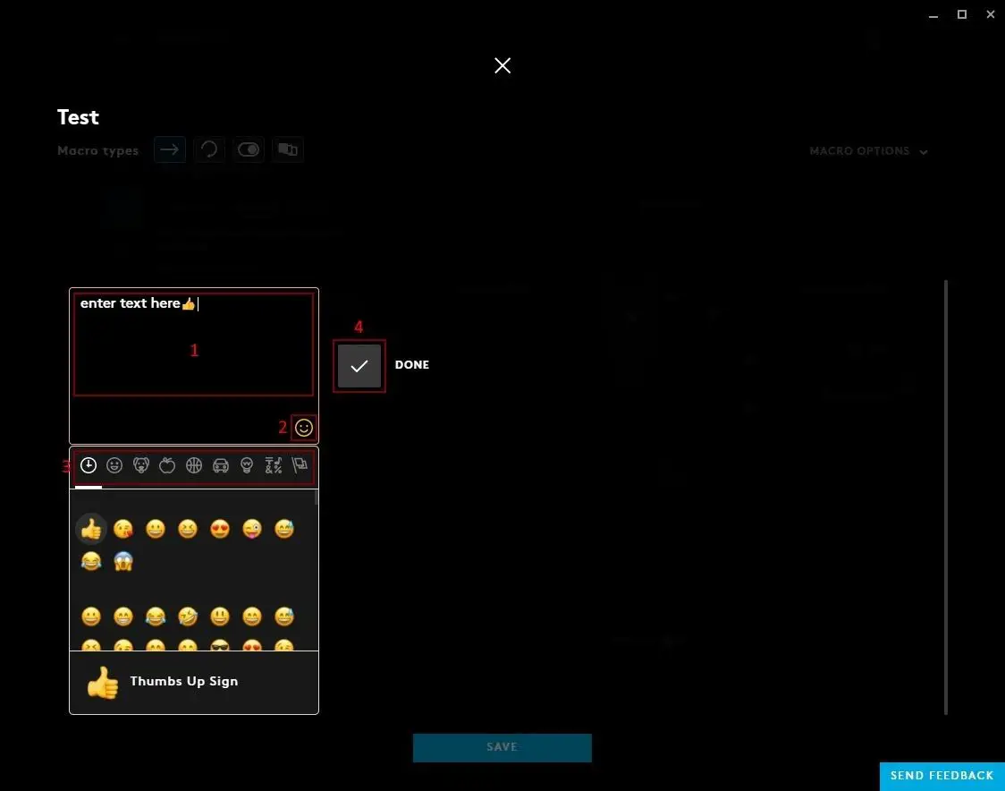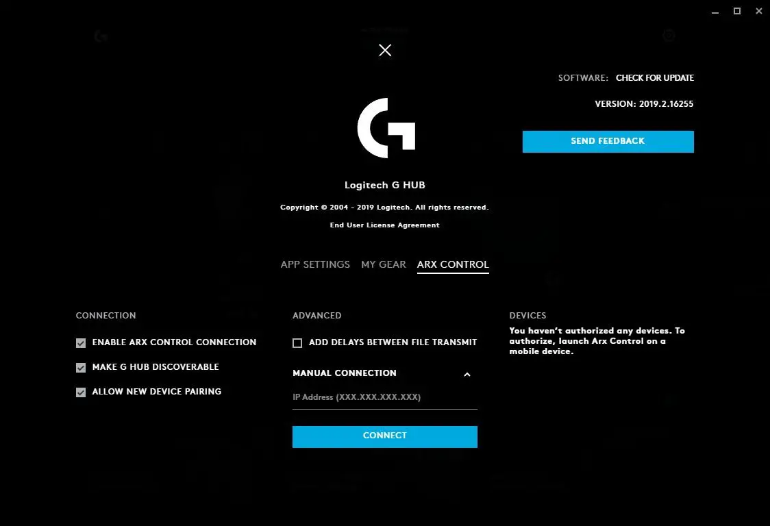 - SEND FEEDBACK. Click this button to send feedback to the Logitech Team. We welcome new ideas, your thoughts and any bugs you find!