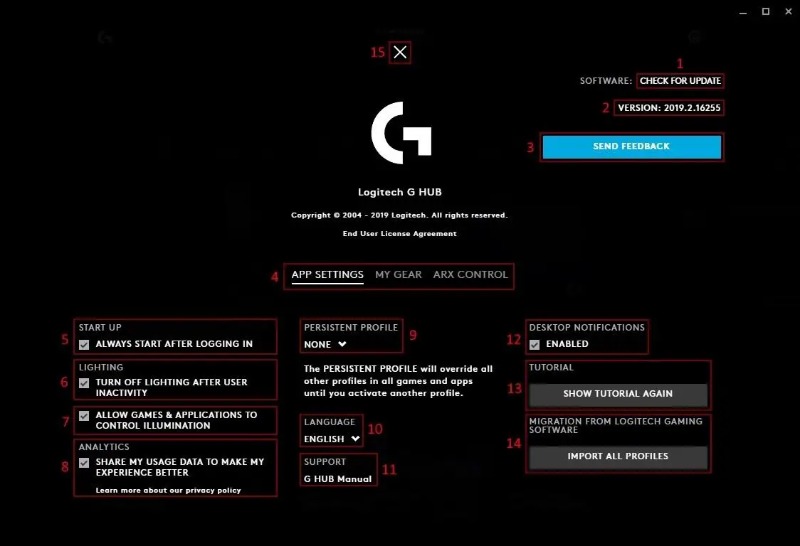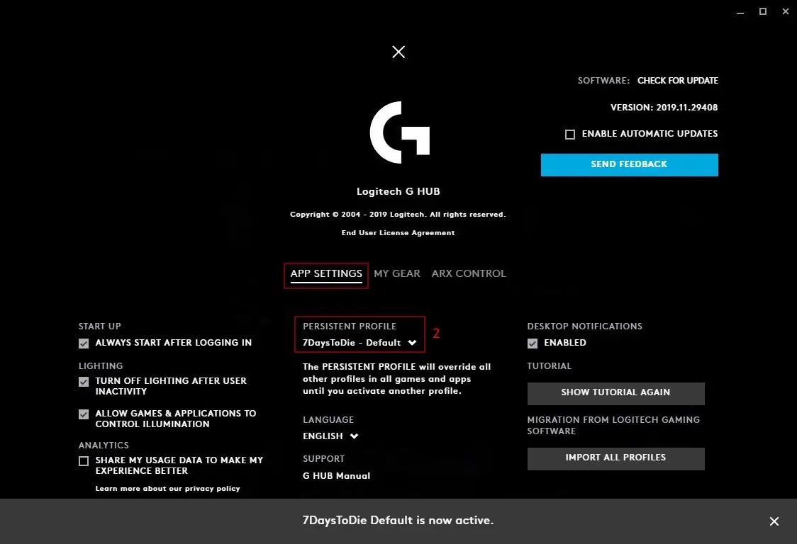- G HUB settings. The Settings page allows you can access APP Settings and My Gear view. You can also configure startup, lighting, analytics, language, desktop notifications and select a Persistent Profile