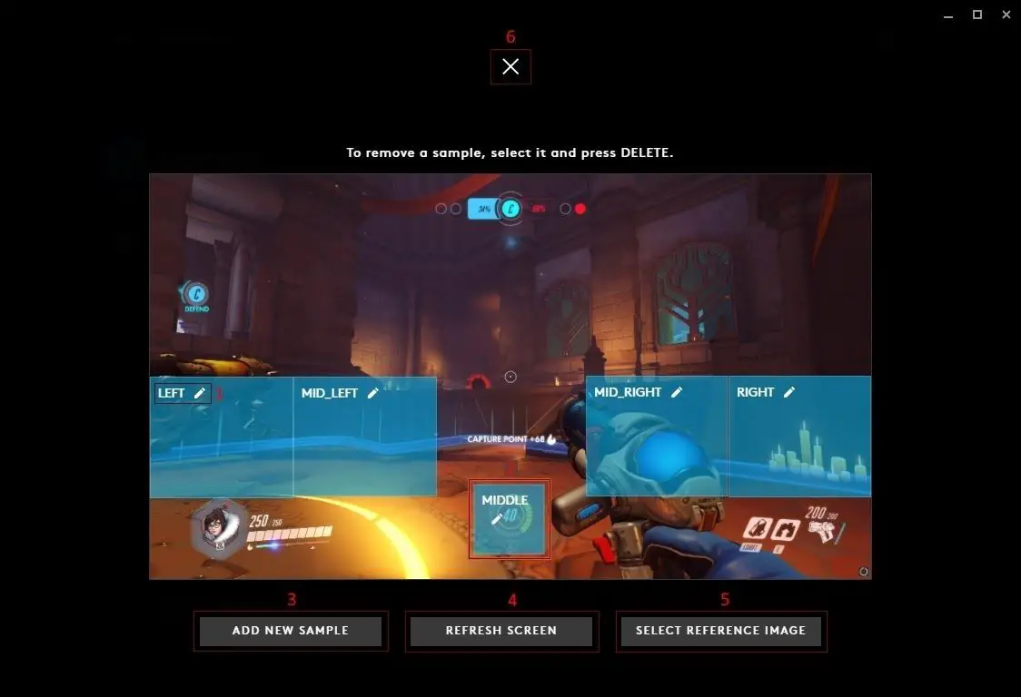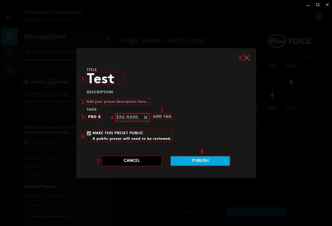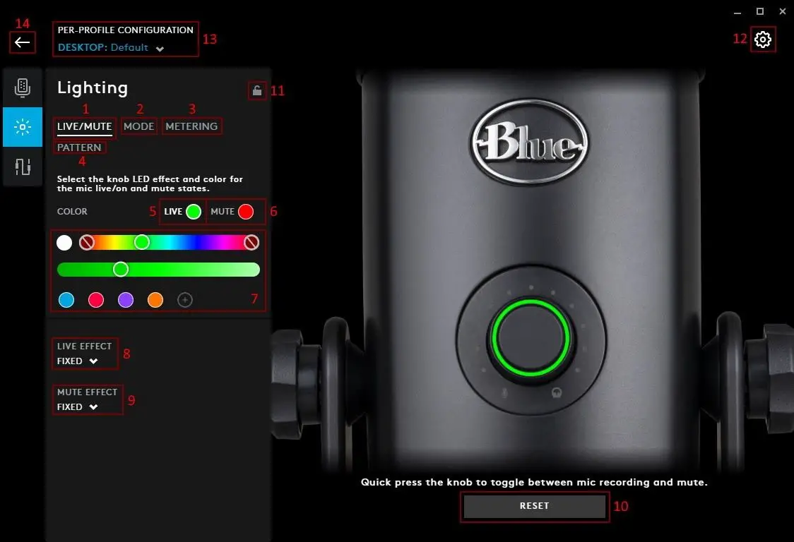 - MUTE. Click MUTE to change the colour of the ring whilst the mic is muted. You can then select a new swatch or create another (7)