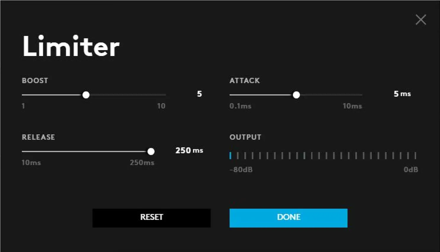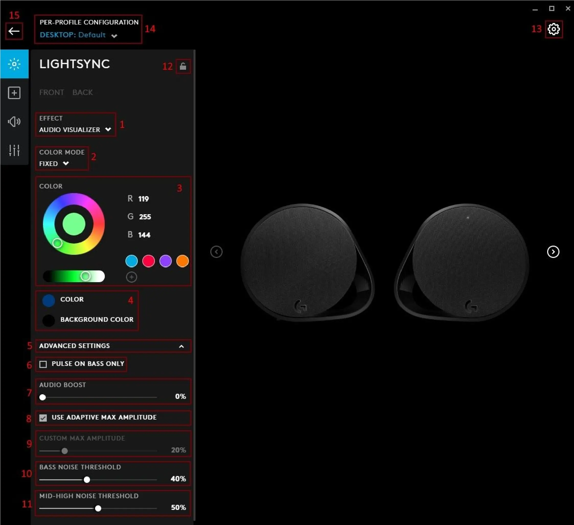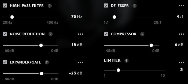- MICROPHONE. Click MICROPHONE to change the colour of the LEDs for the microphone gain. The color palette will expand, select a new colour using the Hue and Brightness sliders or select a different swatch.