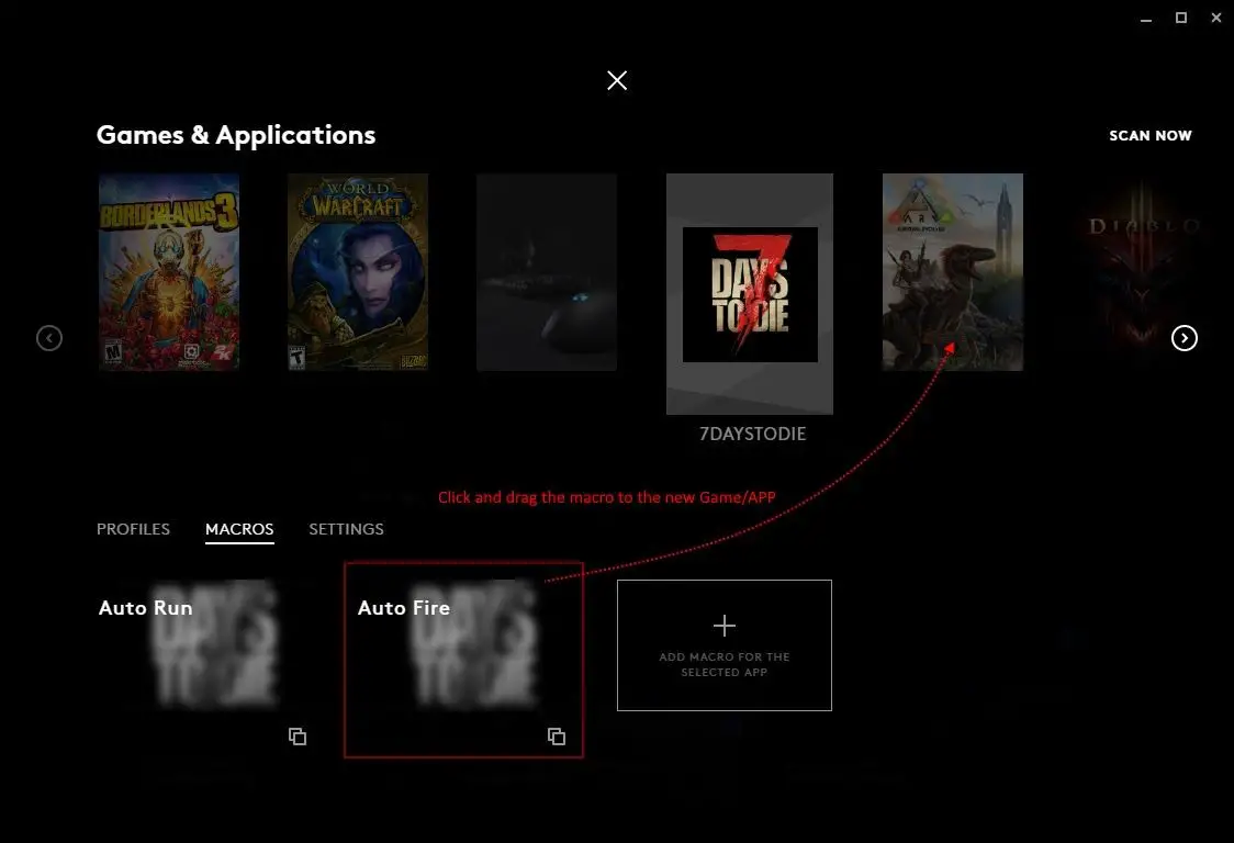 The same method can be used to copy macros over too. Select which macro you want to copy across by click and dragging it to another Game/APP