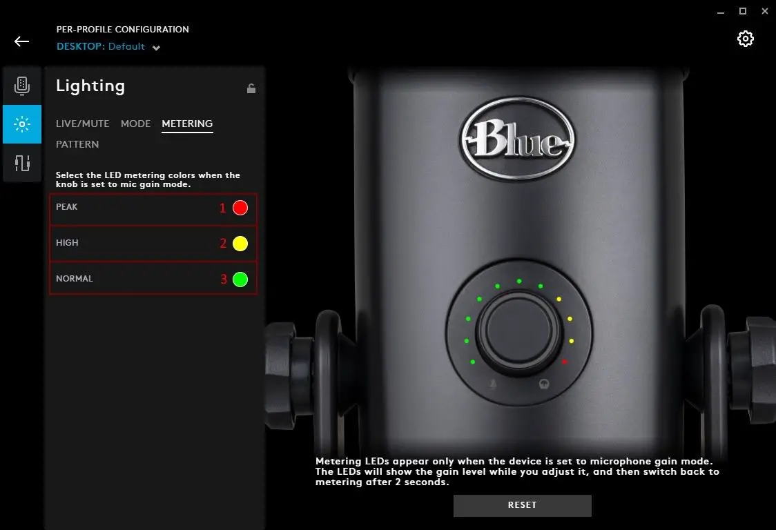 - METERING. The LED metering colours are the dynamic dota around the dial in the microphone mode. These indicate the current mic volume detection.