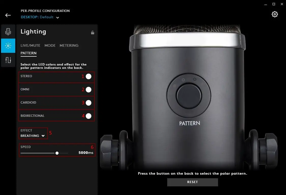 - PATTERN. The rear of the Yeti X has the pattern button which can cycle between 4 modes; STEREO, OMNI, CARDIOID and BIDIRECTIONAL. You can configure each modes colour.