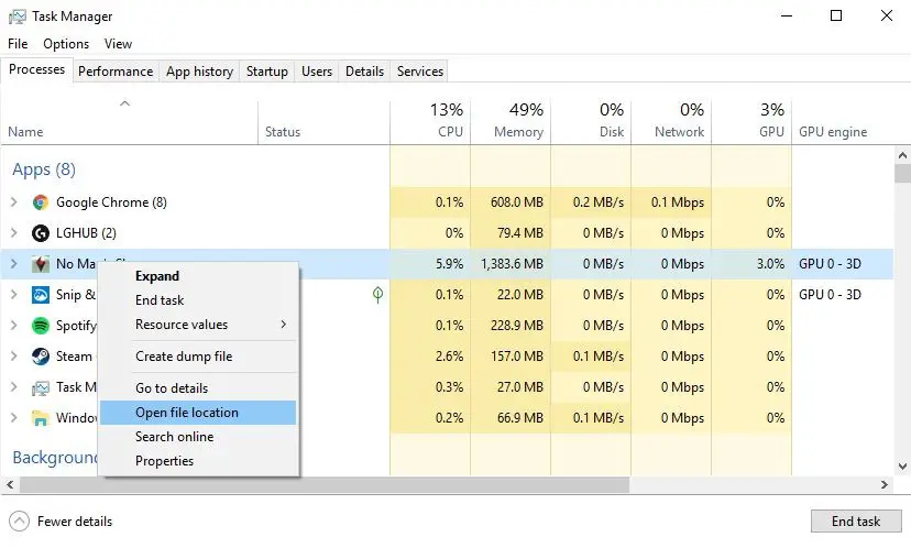 - Right click the process that matches your APP/game and choose Open File Location