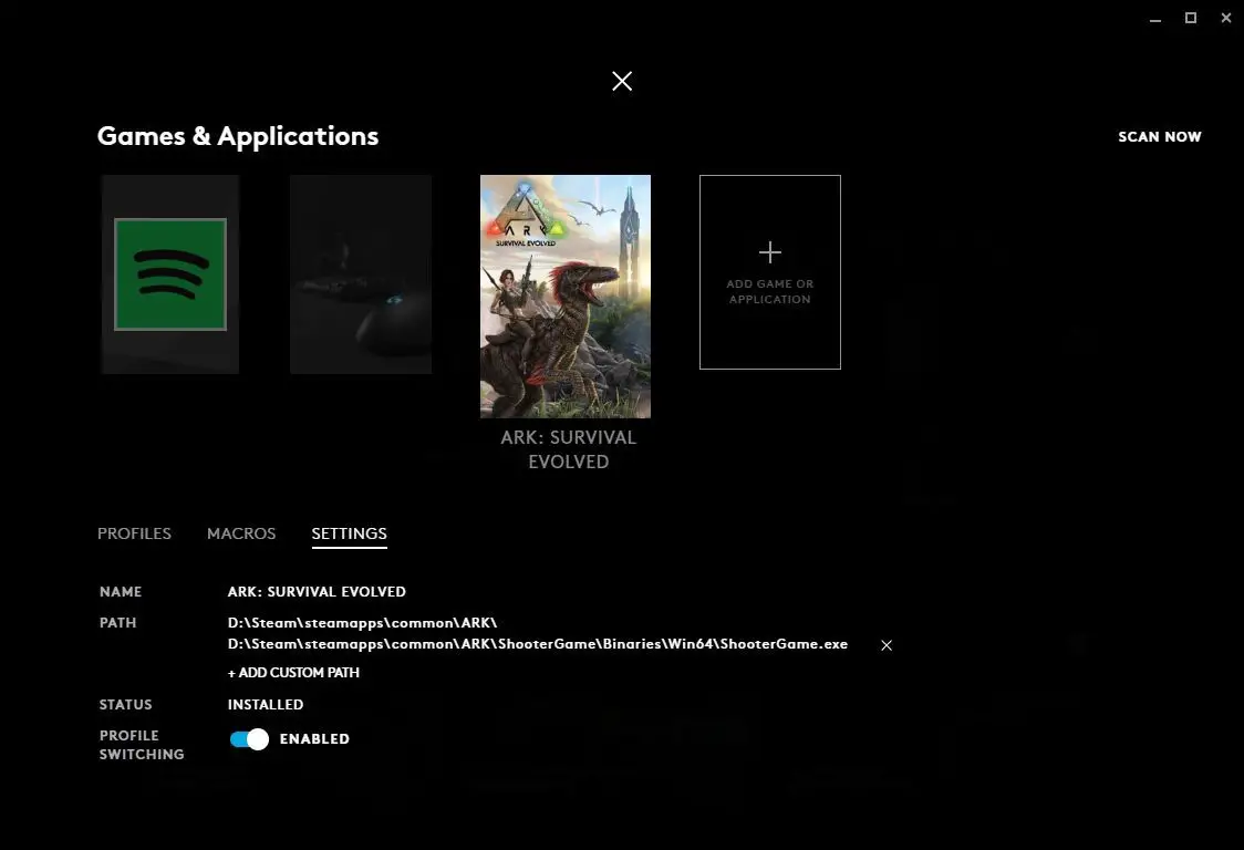 If you look at the PATH, you can see what executables will activate the profile. If the one you need isn’t there, click +ADD CUSTOM PATH, use Explorer to navigate to the correct .exe and click the executable to add. You can add more than 1 path for each Game/APP