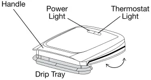 Note: The thermostat light will cycle on and off during cooking as the grill maintains temperature. - Using the handle, lift the lid and carefully place items to be cooked onto the bottom cooking plate.