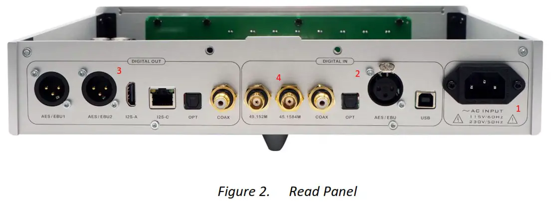 The GAIA supports the following clock frequencies input, leveraging the high-quality OCXO of the TERMINATOR II or TERMINATOR-PLUS DAC, it may be connected to GAIA CLOCK-IN to improve the sonic performance.