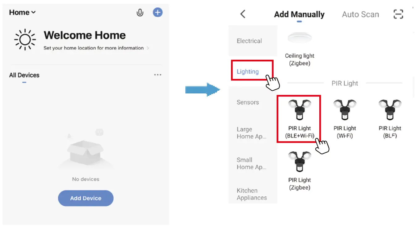 - Tap’+’ button on top right corner to add devices. Tap ‘Lighting’, then choose ‘PIR Light (BLE+Wi-Fi)’ to add the lights.