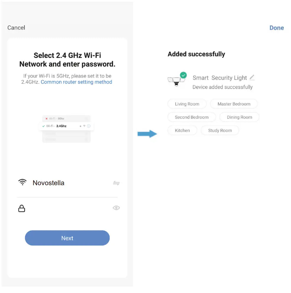 - Choose your WiFi network, enter your password, and tap the ‘Next’ button. Then give a name to the light and tap the ‘Done’ button.