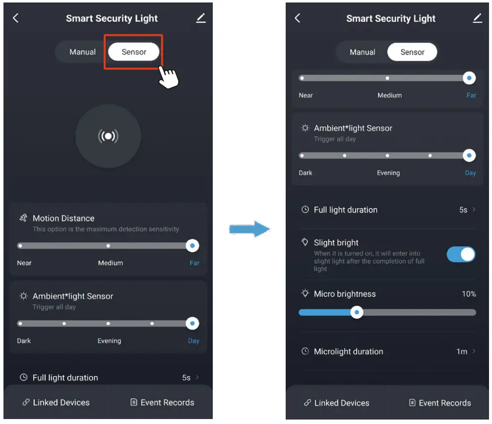 - You can set multiple functions of the sensor light here: sensor distance, day and night control setting, lighting time setting, lighting mode setting.