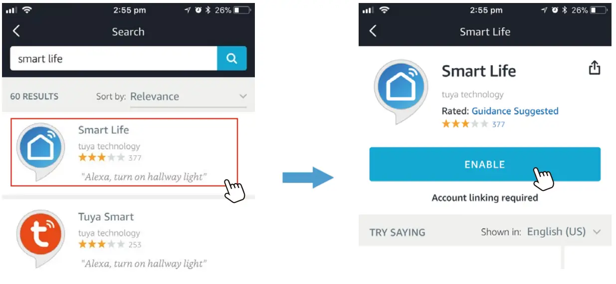 Step B: Type ‘Smart Life’, find’Smart Life’ from the search result and tap it to enable the skill.