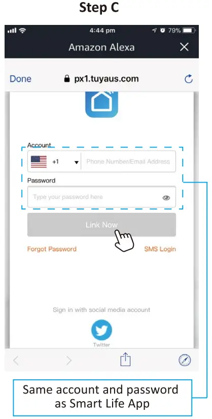 Step C: Enter your Smart Life App account and password. Tap ‘Link Now’, then tap ‘Authorize’ on the next page to bind Smart Life account to Alexa.