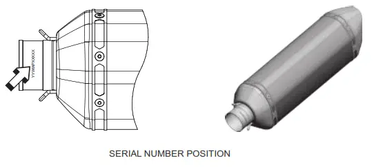 - EVERY EXHAUST SYSTEM MUFFLER HAS ITS UNIQUE SERIAL NUMBER, WHICH IDENTIFIES THE AUTHENTICITY OF THE PRODUCT. YOU CAN FIND THE SERIAL NUMBER ON THE MUFFLER’S INLET PIPE. PLEASE REFER TO THE PICTURE BELOW. PLEASE VERIFY THAT YOUR EXHAUST SYSTEM IS AN ORIGINAL AKRAPOVIČ PRODUCT. IF YOU HAVE ANY DOUBTS, PLEASE CONTACT THE RESELLER WHERE YOU PURCHASED THE EXHAUST SYSTEM OR AKRAPOVIČ PARTNERS. THIS MANUAL, ANY CERTIFICATES AND AKRAPOVIČ WARRANTY APPLY TO ORIGINAL PRODUCTS ONLY.