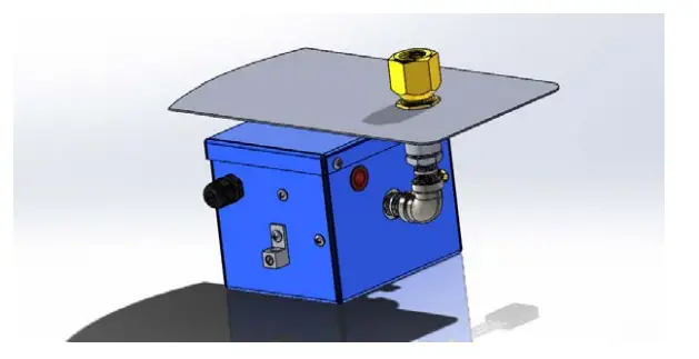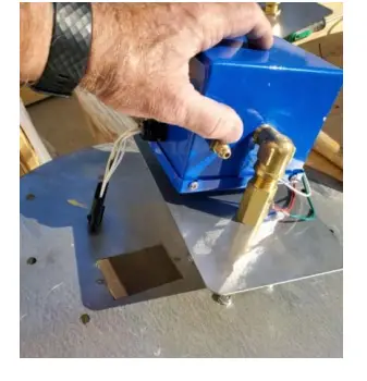 - Take the control box and install the heat shield onto the pipe. To do this, thread the brass pipe nut onto the burner orifice as far down as possible. Place the heat shield over the outlet pipe of the control box and thread the orifice into the outlet pipe until tight. Use a wrench on the burner orifice to tighten fully. Align the heat shield such that it fully shades the control box and tighten the brass pipe nut enough so that the heat shield will not move.