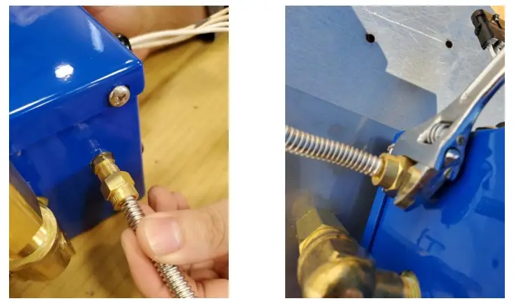 - Take flexible pilot hose and tighten onto the flare fitting. Once snug, use wrench to tighten the hose fitting.
