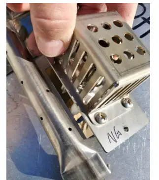 - Place the heat shield over the control box outlet pipe and begin threading the orifice into place. Tighten with a wrench until secure.