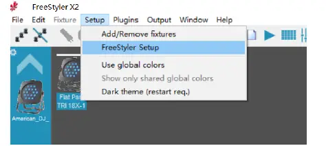 - Open the “FreeStyler” software, click “Setup” and select “FreeStyler Setup”. As shown: