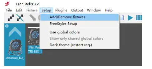 - Open “Setup→Add/Remove fixtures” to add/remove the DMX devices that need to be controlled. As shown: