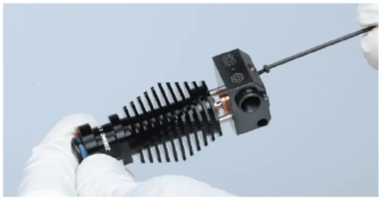 Wait 1 minute after its temperature reaches 285°C to equalize the temperature of all components. - Gently tighten the nozzle first, and at the same time fix the heatblock with the 10mm open – ended wrench carried in the accessories kit, and finally tighten the nozzle with the hexagon bar.