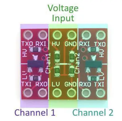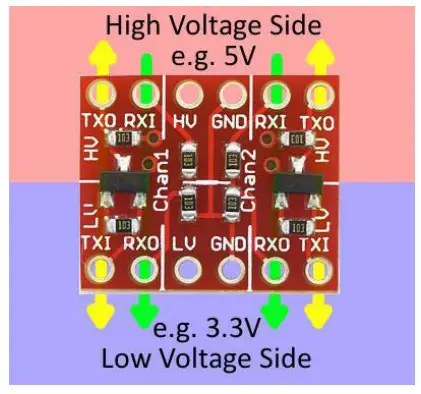 Example: To convert 3.3 V into 5 V, run the 5 V into the HV side and 3.3 V into the LV side. Also, make sure each is grounded.