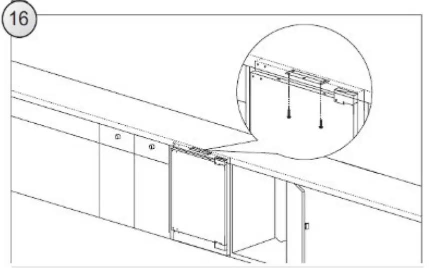 There is a special strip at the top of the appliance. Attach it to the underside of the cabinet with appropriate screws supplied with the assembly kit (Fig. 16).