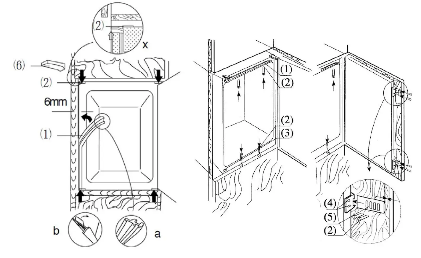 to the power supply after installing the appliance. Remove the cover (6) only if space is restricted. - Place the refrigerator into the kitchen unit. Fix the mountings (1) with screws (2) onto the upper frame when two third of the refrigerator has been pushed in. Then push the refrigerator in completely, ensuring that the gib clamp of the mountings stuck on the horizontal frame of the kitchen unit. Adjust the position of the refrigerator making a 6mm space between inside wall of the kitchen unit and external sides of the refrigerators. Fix the mountings to the horizontal frame of the kitchen unit with screws.