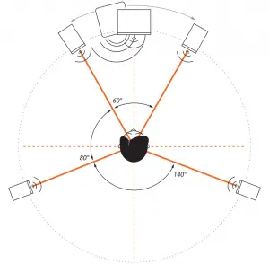 The rear satellites should form an isosceles triangle with the listening position forming an angle of 140º.