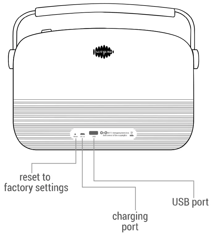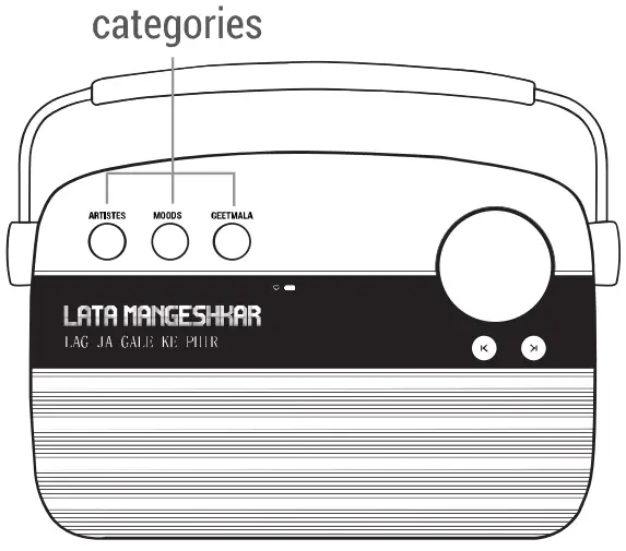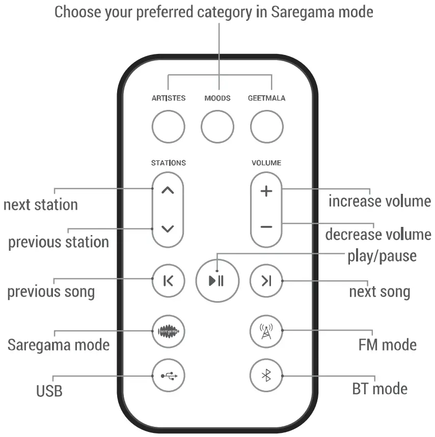 - SAREGAMA: 5000 pre-loaded evergreen songs categorized into Artistes, Moods & Geetmala; this is the default mode on first power on/reset