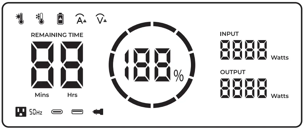 ![]() | AC Outlet Status | Indicates the on/off status and output frequency of the AC Outlet(s). |