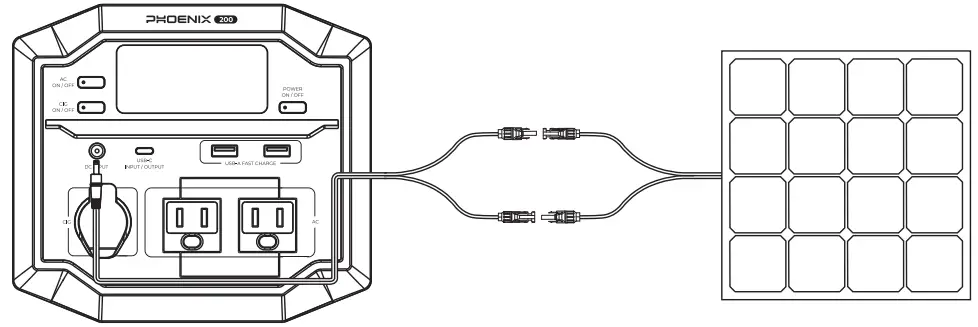 - Connect the DC Input Port of PHOENIX to the solar connectors of the solar panel with a solar charge cable (sold separately). PHOENIX will start charging automatically.