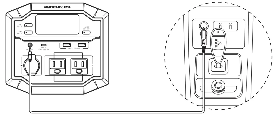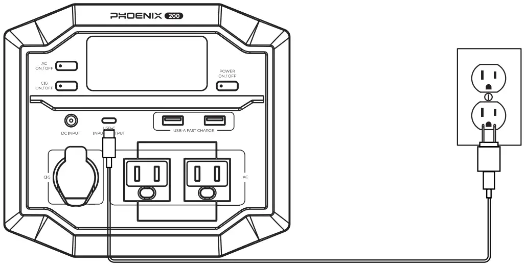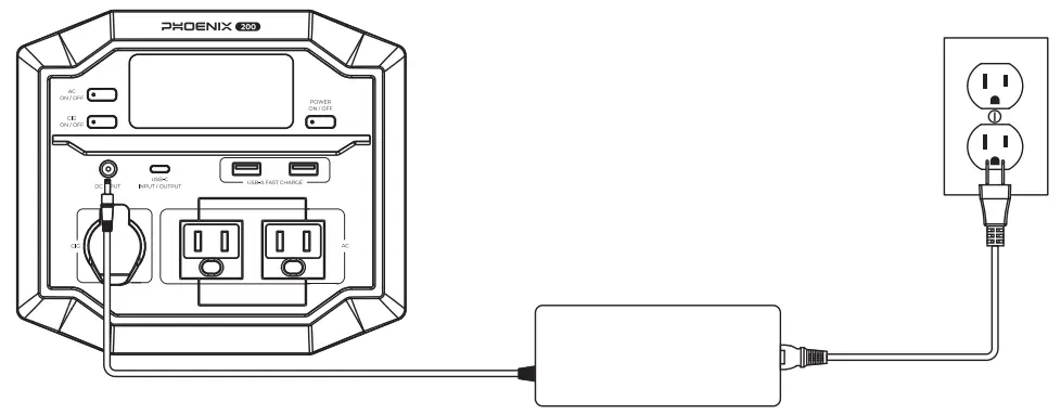 - Connect the DC Input Port of PHOENIX to a wall outlet with the AC Power Cable and AC Adapter. PHOENIX will start charging automatically.