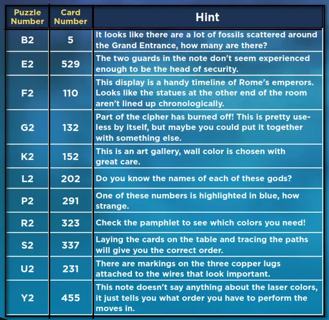 Items found in the museum are freely shared between all players and are used to help solve some puzzles. To use an item, line up the roman numeral cipher with the numbers you’ll find along the bottoms of some puzzle cards. Draw the card that matches the number indicated by the cipher. If you can’t find that number in the deck, you’ve incorrectly solved that cipher and must try again.