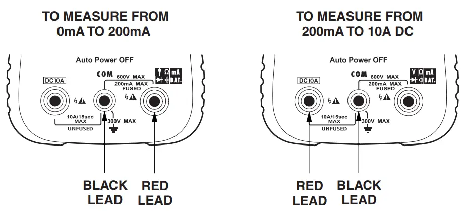 - Plug the RED test lead into the “mA” or the “DC10A” jack of the multimeter, as applicable; plug the BLACK test lead to the “COM” jack.