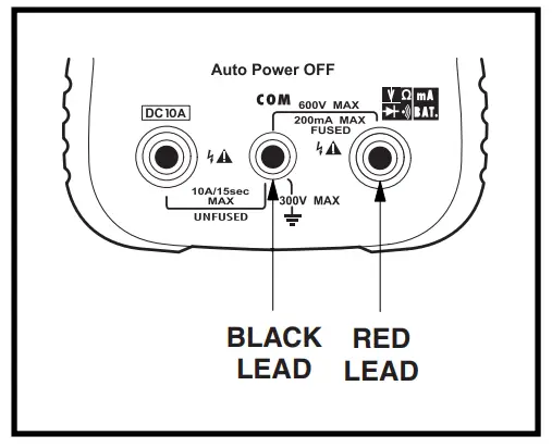 - DC10A Input Jack: For red test lead probe connection when measuring high DC current (up to 10 amps only).