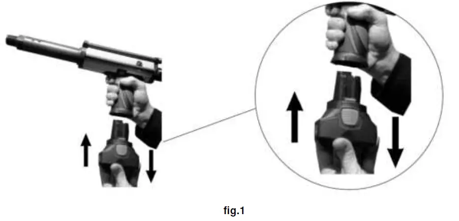 - To remove the battery from the tool, press the red buttons on both sides of the battery at the same time (fig.1).