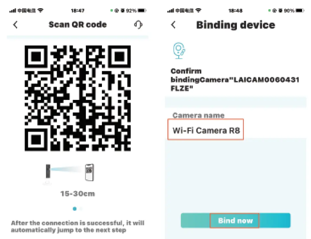 Step 7: QR Code Configuration: Place the QR code about 10cm away from the camera lens, keep the camera facing the QR code. after about 5 seconds, you can release it when pop up Binding Device dialog. The blue light is always on, the connect is successful.