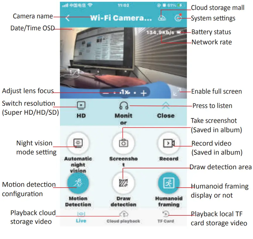| Cloud storage | Supports (keep free 3 days) |