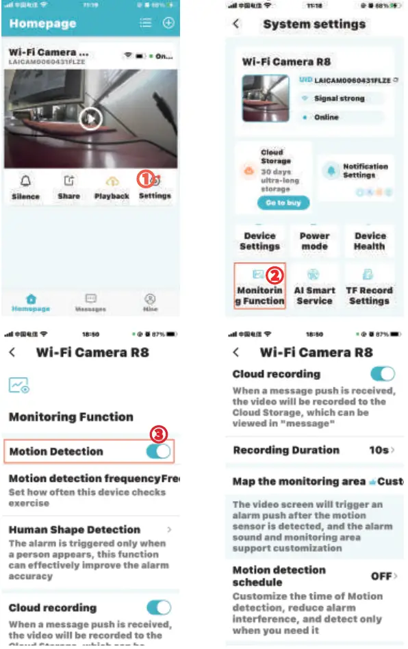 A: First, activate the Client notification in the ‘Notification Settings’ menu of ‘System Settings’; Then turn on the ‘Motion Detection’ switch in the ‘Monitoring Function’ menu item.