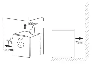 Before using the appliance for the first time, wash the interior and all internal accessories with lukewarm water and some neutral soap so as to remove the typical smell of a brand new product, then dry thoroughly. Important! It is necessary to have good ventilation around the freezer to allow for the dissipation of heat, high efficiency, and low power consumption. For this reason, sufficiently cleared space should be available around the freezer. It is advisable for there to be 75mm separating the back of the freezer to the wall and at least 100mm of space on