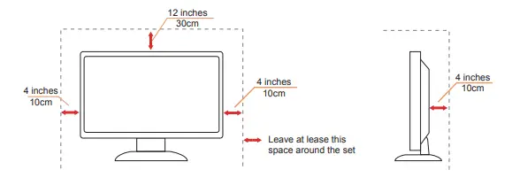 Never push any object into the slot on the monitor cabinet. It could damage circuit parts causing a fire or electric shock. Never spill liquids on the monitor. Do not place the front of the product on the floor. If you mount the monitor on a wall or shelf, use a mounting kit approved by the manufacturer and follow the kit instructions. Leave some space around the monitor as shown below. Otherwise, air circulation may be inadequate hence overheating may cause a fire or damage to the monitor. See below the recommended ventilation areas around the monitor when the monitor is installed on the wall or on the stand: