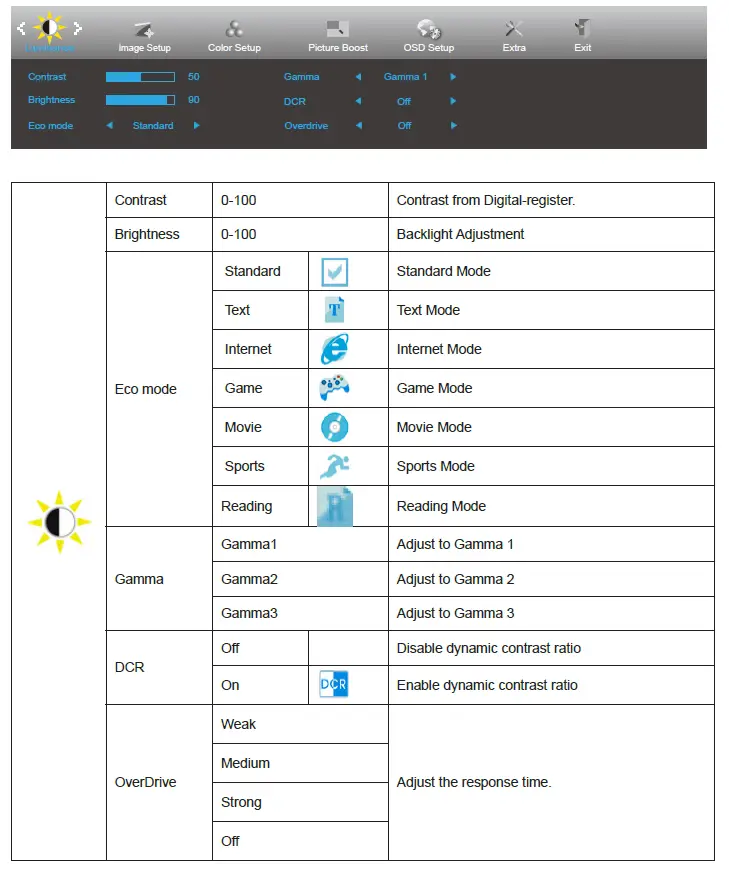 When there is no OSD, press “down” to active ECO adjustment bar, press left or right to adjust ECO mode.
