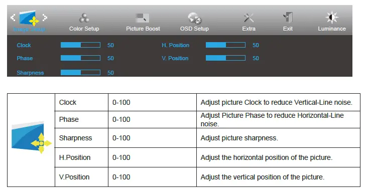 | Horizontal or vertical disturbances on the screen | Use Windows 7/8/10 shut-down mode to adjust CLOCK and FOCUS. Press to auto-adjust. |
