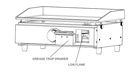 Remove the griddle plate or the grease trap drawer before lighting as to visually check the fire. Light burner and turn knob from high to low you will see a smaller fire in the low position and bigger in the high position. Check the fire before each use. If you only see low flame, refer to Burner has low flame regardless of knob position in the Troubleshooting section. Change the griddle plate or grease drawer before cooking.