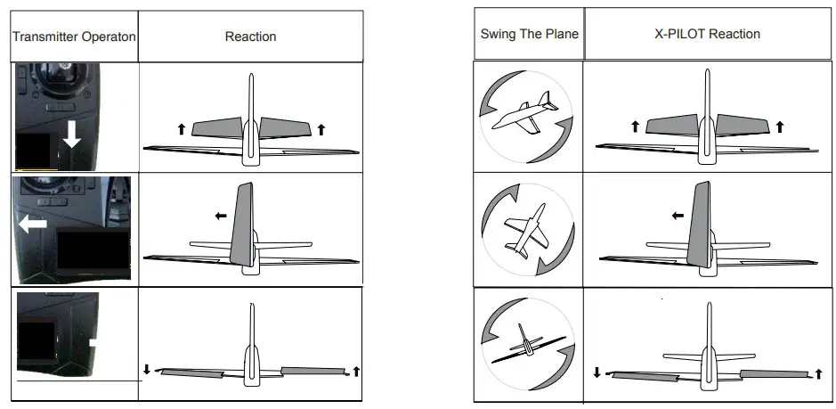 Move the sticks(except the throttle stick) to see if all servo surfaces react correctly as shown in the left diagram(left throttle for example). Swing your plane to check if all servo surfaces react correctly as shown in the right diagram.