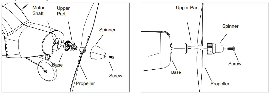 The propeller saver keeps the propeller from damage, and prevent the electronic components from over current. When the airplane hits any obstacle, the propeller will loose from the base. To install the