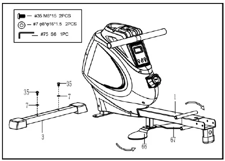 - Attach the Front Stabilizer (No. 3) to the Main Frame (No. 1) using 2 Screws (No. 35) and 2 Washers (No. 7). Tighten and secure with Allen Wrench (No. 75).