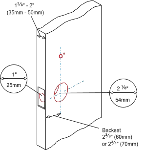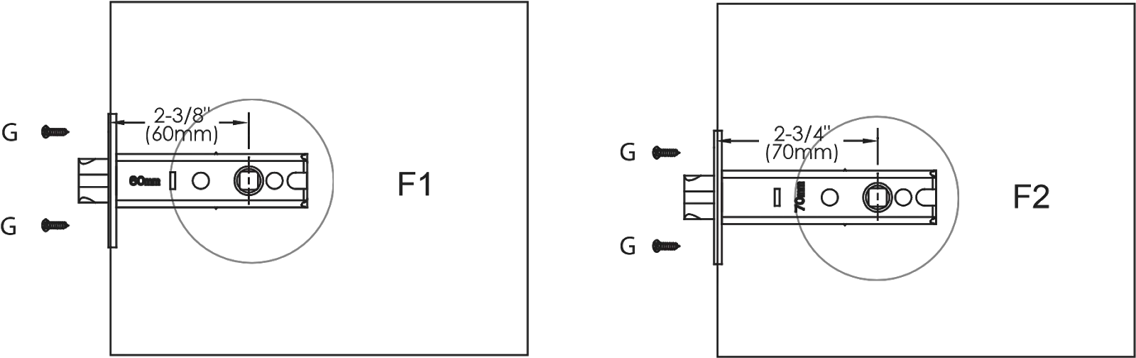 2.1 Measure the distance between center of front door hole to the edge of your door and select the correct lockset. Select F1 if 2-3/8″(60mm) or F2 if 2-3/4″(70mm).