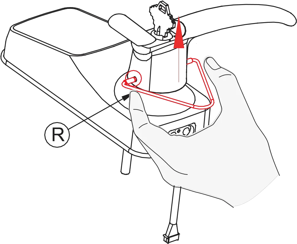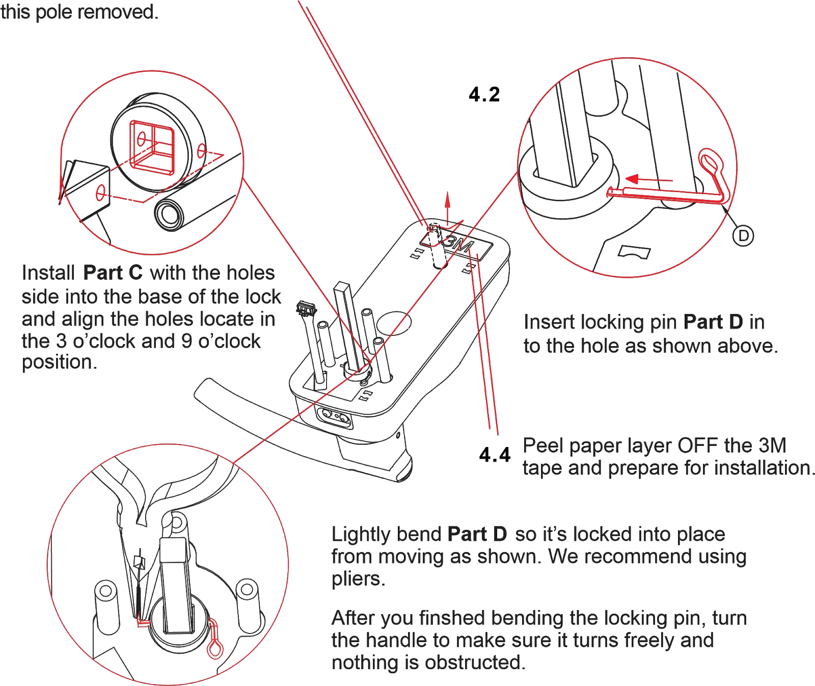 3.2 Use the provided Clamping tool (R) to push in the two metal pins at the base of the lock handle, located at the 3 o’clock and 9 o’clock positions, and remove the handle once the pins are compressed.